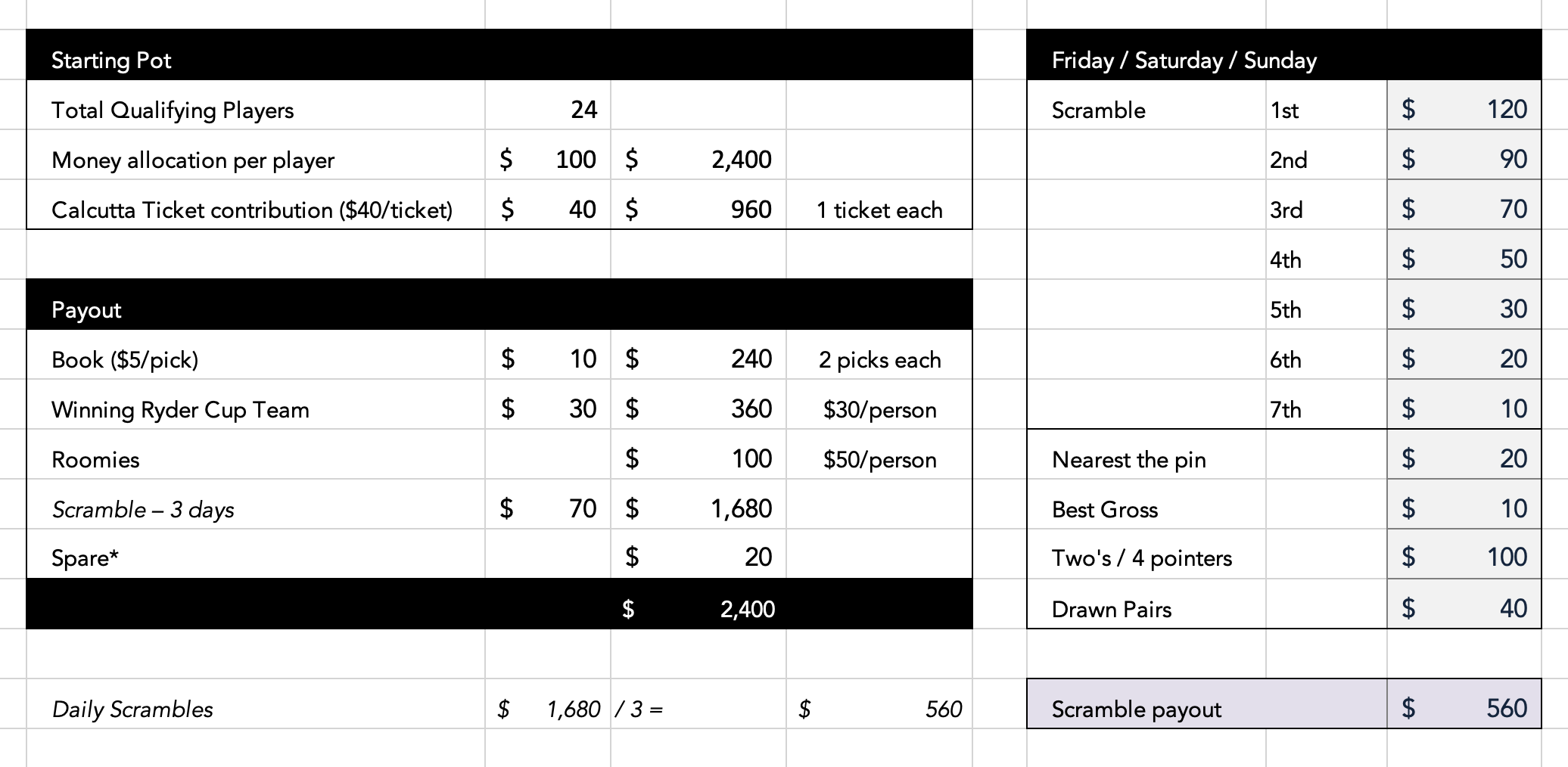 There's a lot of competitions for the weekend, a scramble for each round, the book, roomies and the Ryder cup so if you're new to the trip, have a read of the Competition page or a chat with any past attendees and they'll fill you in!