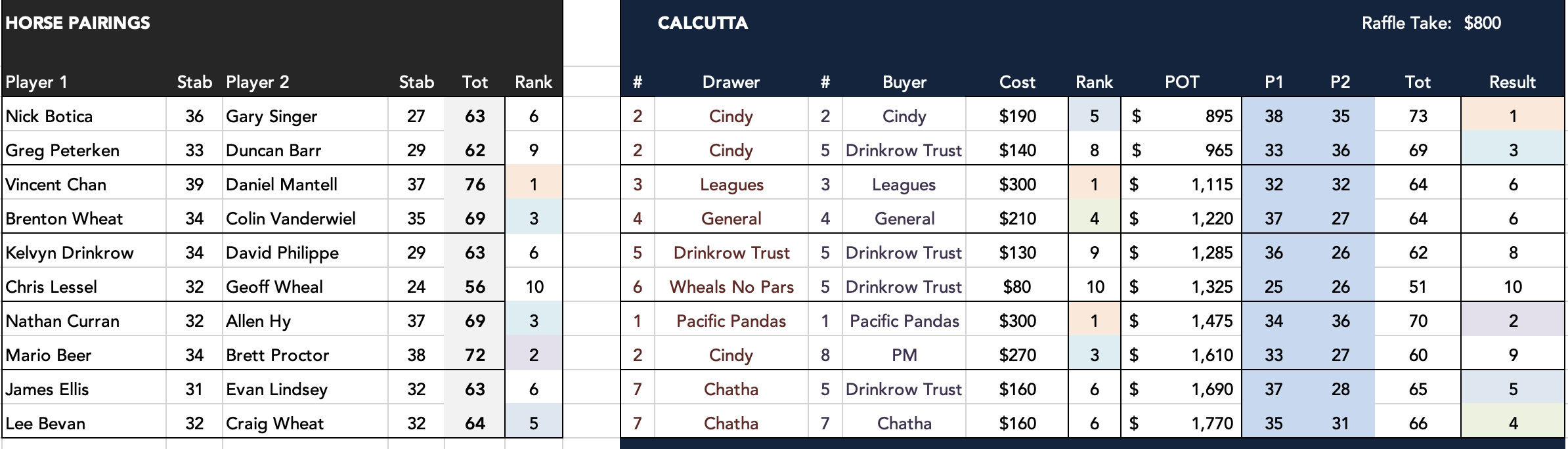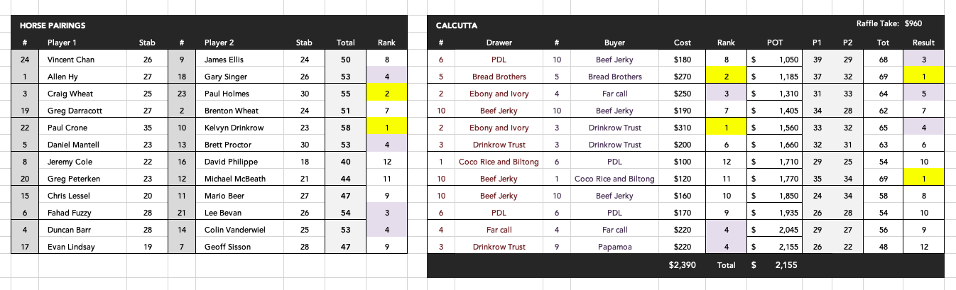 As an attending player you will receive 2 tickets for the Calcutta – if you wish you can form a syndicate amongst your peers (max 3 people), to increase the chances of winning and spreading the cost.