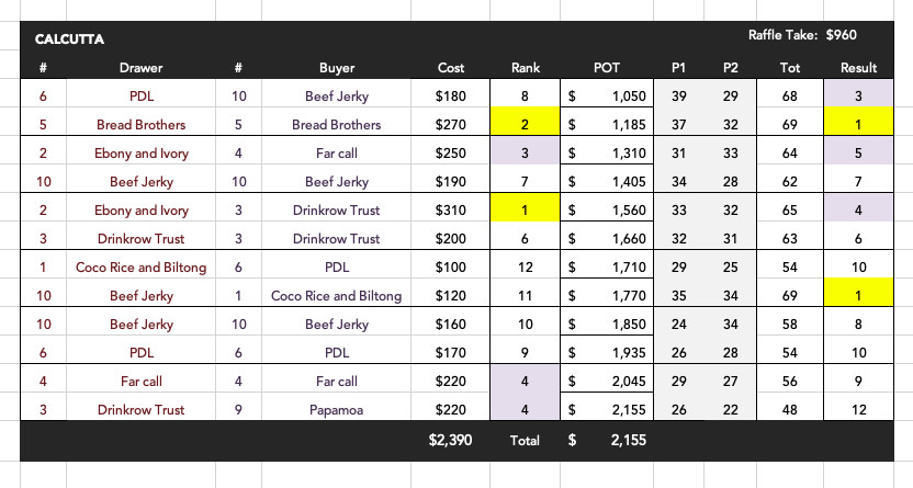 The format of the “Calcutta” takes quite a bit of explanation – which is usually only fully understood once you’ve been involved in a couple of them – but below is an attempt to explain it as simply as possible.