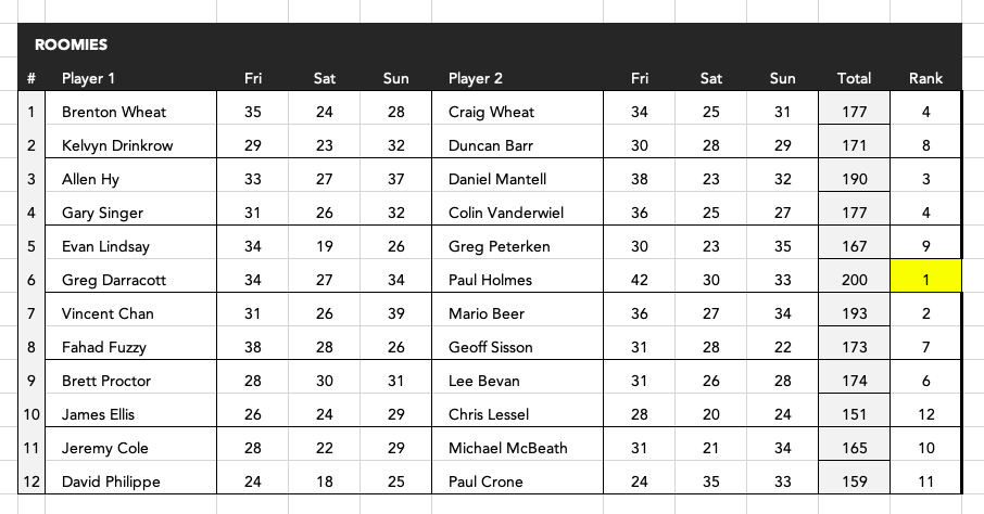 Two man teams based on your room mate. Best combined stableford over the 3 days. Single, not staying at the accomodation and 3 man rooms will mean some players won't actually be rooming with their roommate. We will sort this and tell you who your roomie is for the weekend.