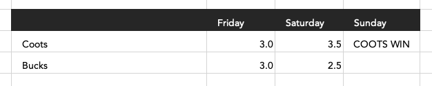The first raffle ticket drawn out the hat is the 'Drawer' of the first pair of golfers – he will elect to matchplay an opposing member of the other team. e.g. Nick(Bucks) gets drawn out, and calls out Greg(Coots), Vincent(Coots) gets drawn out next and calls out Brenton(Bucks) etc. This will continue down until the first column is complete. Repeat for the 2nd column.